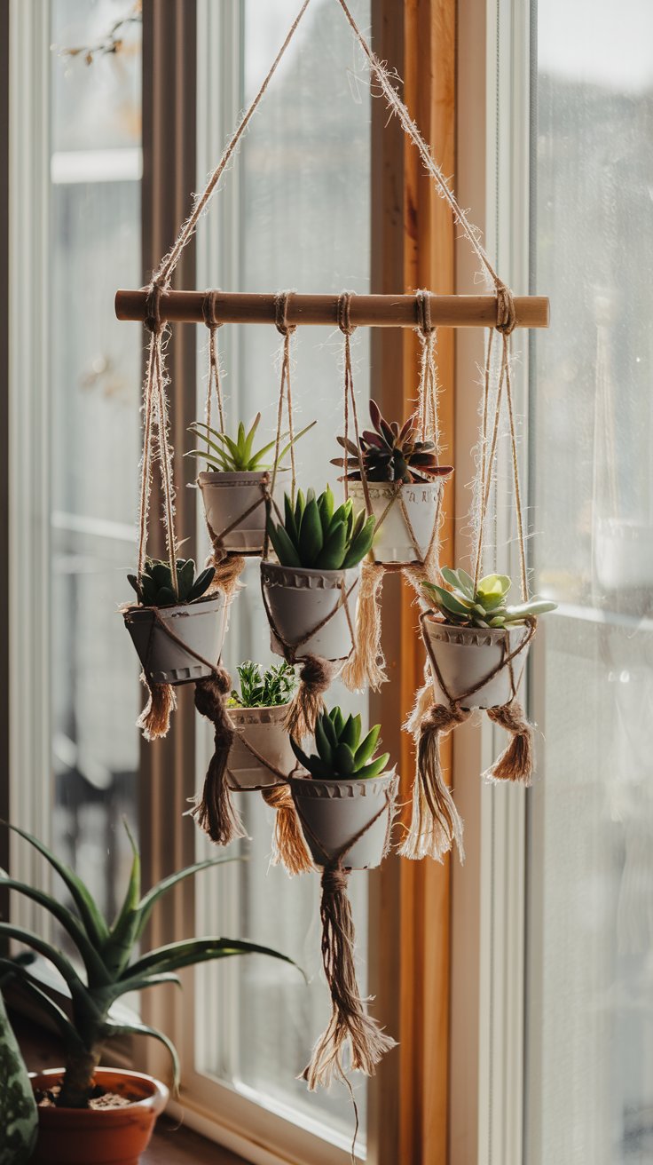 Bring a touch of rustic charm to your home by crafting a wooden frame that holds small succulent pots. The frame can be suspended by durable jute ropes, creating a stunning display perfect for a sunlit window. Succulents thrive in bright light, making this idea both practical and visually appealing. Use lightweight pots to ensure the jute ropes hold the weight securely and consider arranging the succulents in varying shades of green for added depth and contrast.
