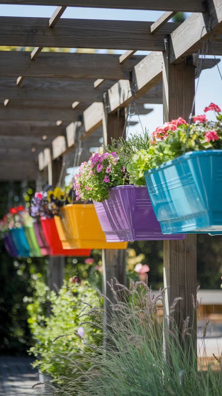 Enhance your outdoor space by hanging colorful planters filled with flowers and herbs from a wooden pergola. The natural sunlight will keep the blooms vibrant, while the colors add a playful touch to your patio or garden. Mixing bright flowers like marigolds with fragrant herbs such as basil and lavender creates a delightful sensory experience. Secure the planters with strong hooks to withstand the elements and keep them in place.
