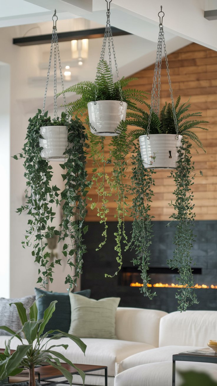 For a sleek, modern vibe, suspend white ceramic planters with metal chains in your living room. Cascading ivy and ferns bring life to the minimalist design, creating a lush and inviting atmosphere. To keep the planters looking pristine, choose low-maintenance plants that require minimal watering. The metal chains add a contemporary touch, ensuring that the setup remains both stylish and functional while making plant care a breeze.