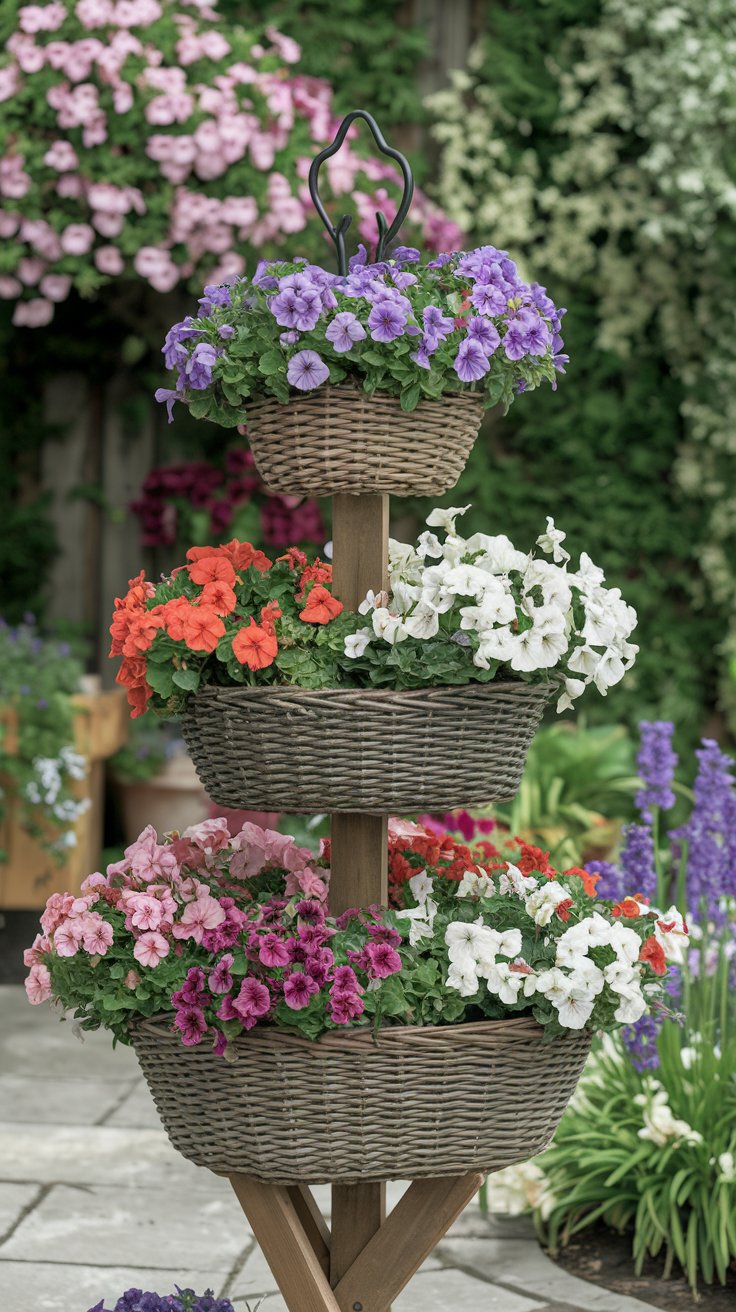 Craft a wooden stand featuring tiered baskets, each brimming with blooming flowers, to serve as a striking centerpiece for your garden. Choose weather-resistant wood and apply a clear sealant to protect it from the elements. The cascading floral display adds color and charm to any space, and the tiers make it easy to care for multiple plants in one area. Place the stand in a sunny spot for maximum impact.
