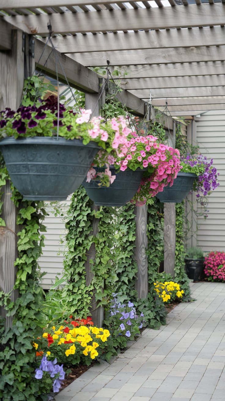Suspend oversized planters from a pergola, filling them with colorful petunias and cascading ivy for a bold and beautiful garden feature. The larger planters make a striking statement, drawing attention to your outdoor space. Use durable hooks and chains to support the planters, and ensure they are positioned to receive ample sunlight. For added drama, mix plants with varying heights and textures to create a lush, layered effect.