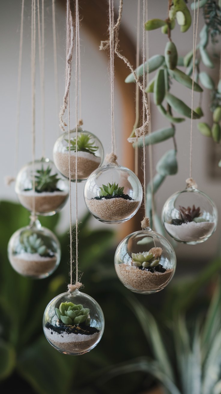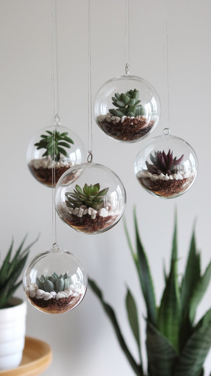 Add a modern touch to your home with glass globes suspended by thin wires. Fill each globe with small succulents and decorative white pebbles for an elegant yet minimalist look. To keep your succulents thriving, use a spray bottle for watering, ensuring you don t oversaturate the plants. Hang the globes near a window for optimal light and consider grouping them at different heights to create a dynamic visual effect.