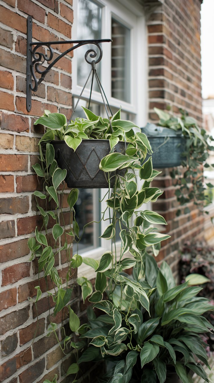 Give your outdoor or indoor wall a vintage makeover by hanging metal baskets filled with trailing plants like pothos. Attach the baskets to vintage-style brackets on a brick wall for an old-world charm. To create a dramatic cascading effect, choose trailing plants that grow lush and long. The setup is perfect for adding greenery to unused wall space while keeping plants off the ground and within easy reach.