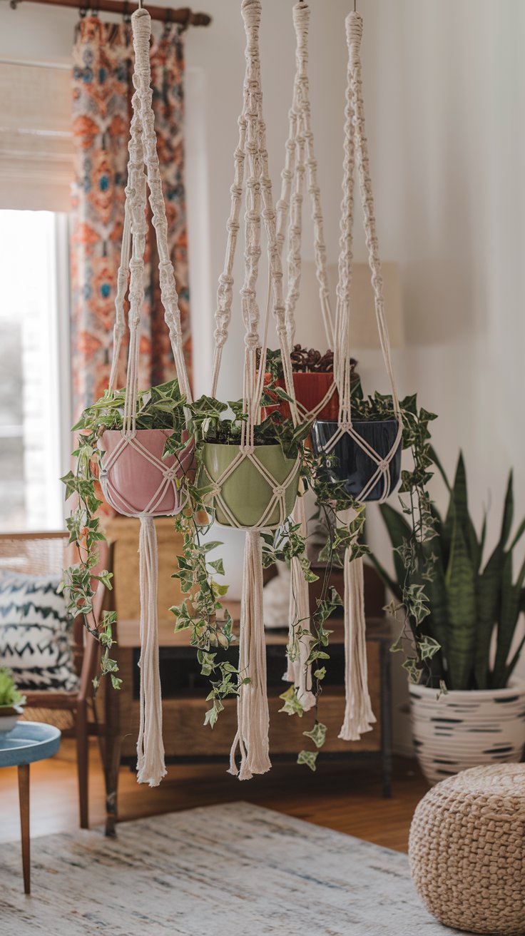 Bring boho vibes into your living space with handmade macramé hangers cradling colorful ceramic pots. The natural textures of the macramé pair beautifully with trailing ivy or pothos, creating a relaxing and artistic atmosphere. Choose vibrant pots to contrast with the neutral tones of the macramé, adding a splash of color. Hang the planters at varying heights to create depth and visual interest in your boho-inspired decor.