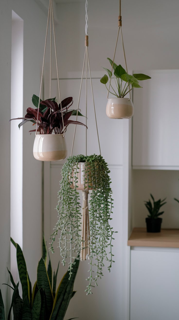 Boost the air quality in your home with a trio of sleek ceramic planters filled with air-purifying plants. Hang them in a modern apartment for a stylish yet functional display. Opt for plants like snake plants or pothos, which are known for their ability to filter toxins from the air. The clean lines of the ceramic planters pair well with minimalist decor, making this setup both attractive and beneficial for your health.