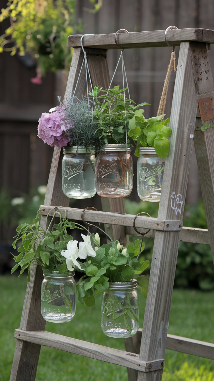 Turn a wooden ladder into a creative hanging planter by suspending mason jars filled with fresh herbs and flowers. This rustic display works beautifully in kitchens or gardens, offering both visual appeal and functionality. Drill small holes in the mason jar lids to ensure proper airflow, helping your plants stay healthy. Lean the ladder against a wall or secure it for stability, and enjoy the layered charm it brings to your space.