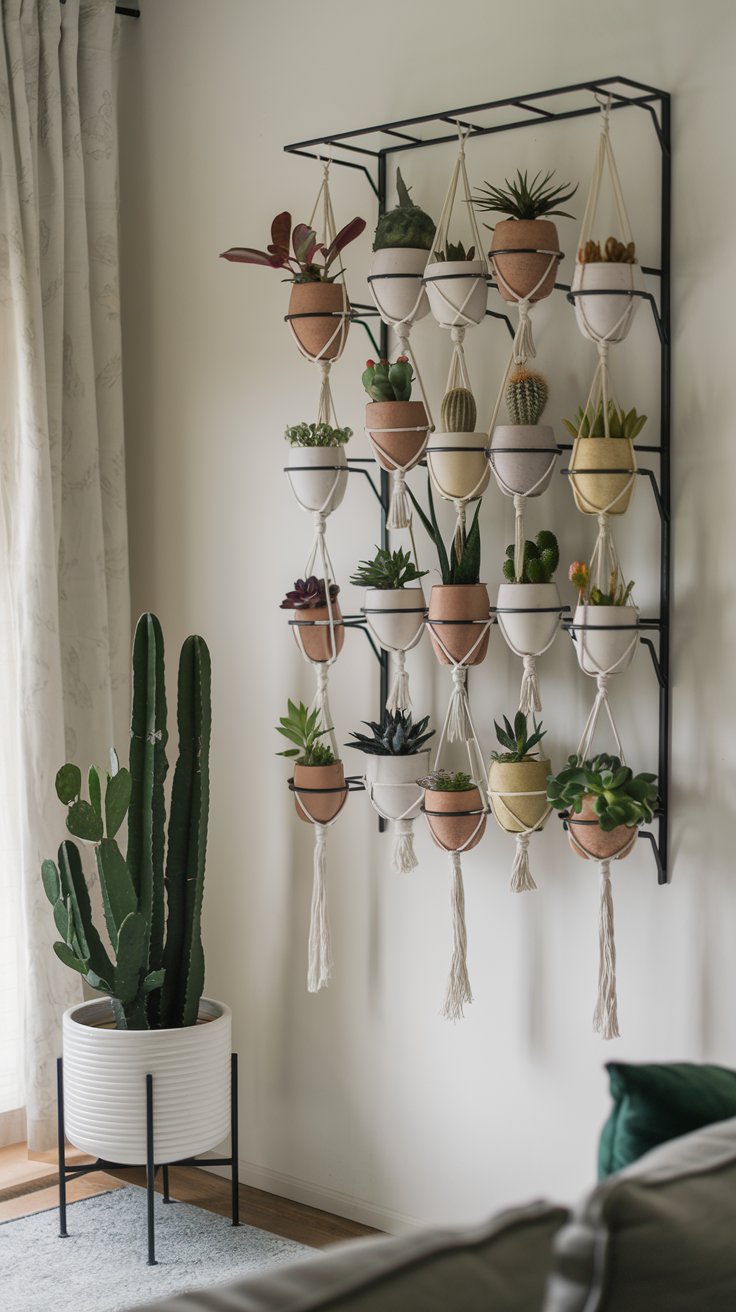 Create a sleek and modern living room display with a wall-mounted rack featuring hanging planters filled with various cacti and succulents. The clean lines of the rack complement the minimalist design, while the plants add texture and life. Use cactus soil for optimal drainage and arrange the planters in an asymmetrical pattern for a contemporary look. This idea is perfect for adding greenery without cluttering your floor space.