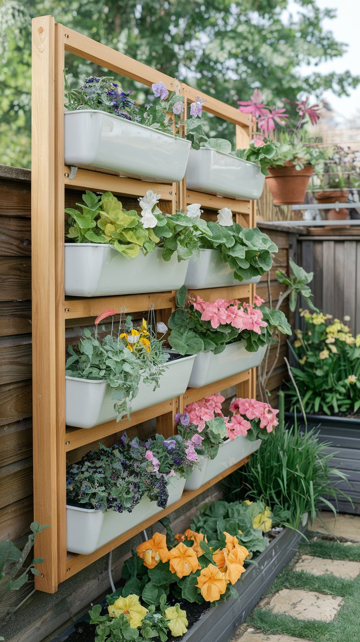 Transform a vertical wooden frame into a hanging garden masterpiece by attaching rows of planters filled with vibrant flowers and greenery. This setup brings color and life to your backyard while using minimal ground space. Rotate the plants seasonally to keep the display fresh and dynamic. Secure the frame with strong brackets to ensure stability, and choose flowers in complementary colors for a harmonious and eye-catching arrangement.