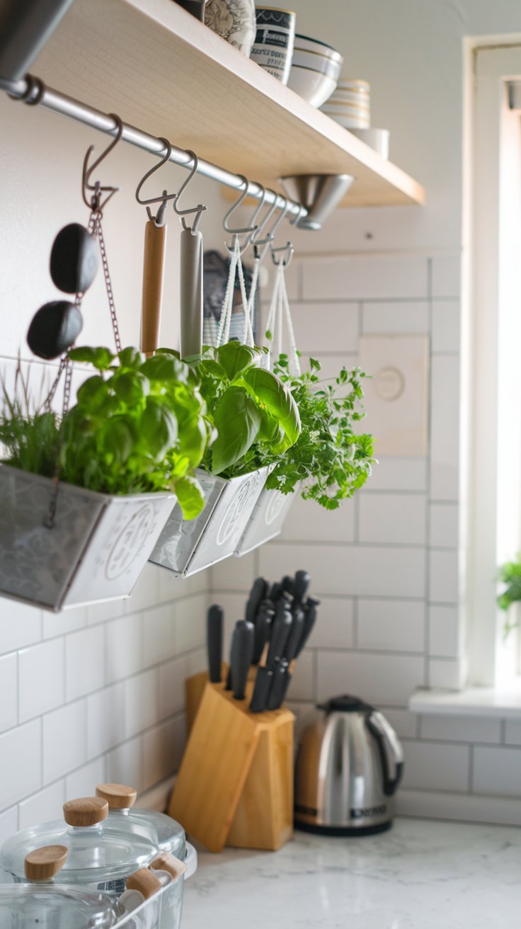 Enhance your culinary space by hanging small planters filled with fresh herbs like basil, parsley, and thyme from a wooden rod in your kitchen. This setup not only adds greenery but also provides easy access to fresh ingredients for your cooking. Position the rod near a window to give the herbs the sunlight they need to thrive. Secure the planters firmly and water them regularly to ensure a thriving mini-garden.