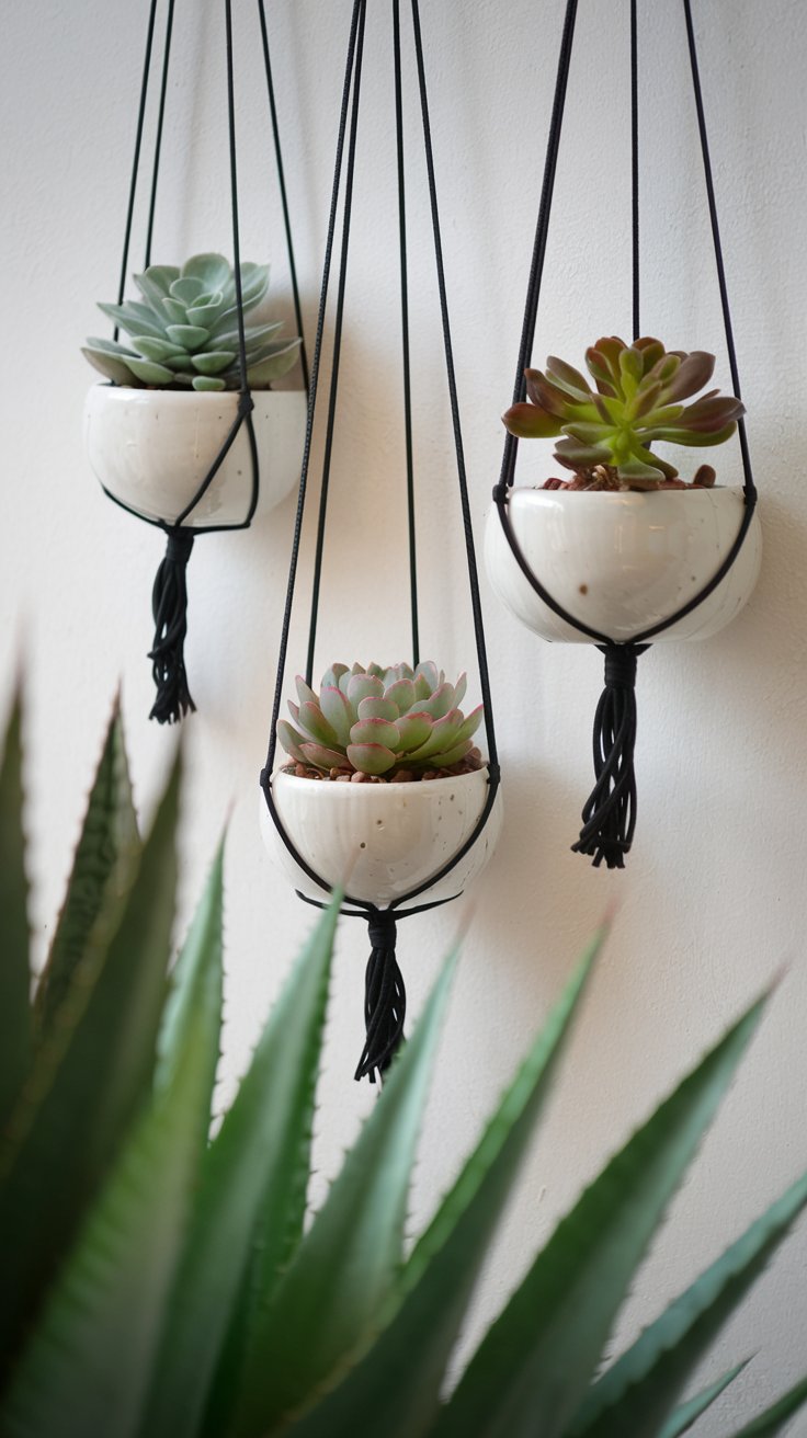 For a minimalist look, hang simple white ceramic planters with black cords against a white wall. Fill them with small succulents to add greenery without overwhelming the space. The contrast between the black cords and white planters creates a sleek, modern aesthetic. Use plants with vibrant green hues to enhance the visual impact, and position the planters in a well-lit area to keep them thriving.