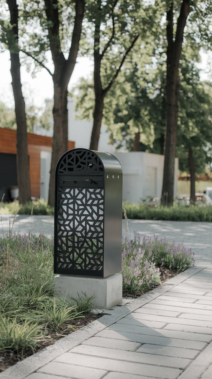 A modern black mailbox with a geometric pattern, placed on a concrete base, offers sharp and sleek curb appeal. Use textured concrete for added interest, and ensure the base is level for a polished look.