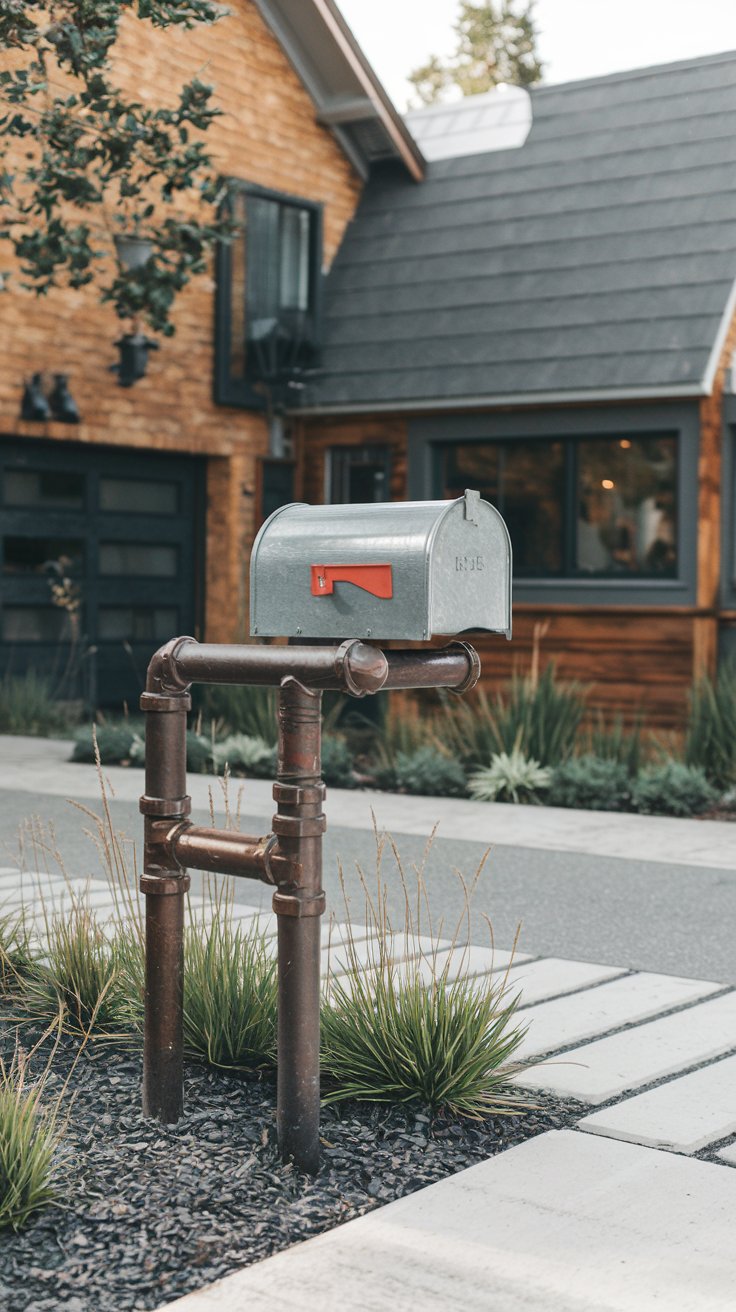 A mailbox crafted from metal pipes and a galvanized steel box adds rugged, industrial charm. Use black piping for a bold contrast and coat it with a rust-proof finish for longevity.