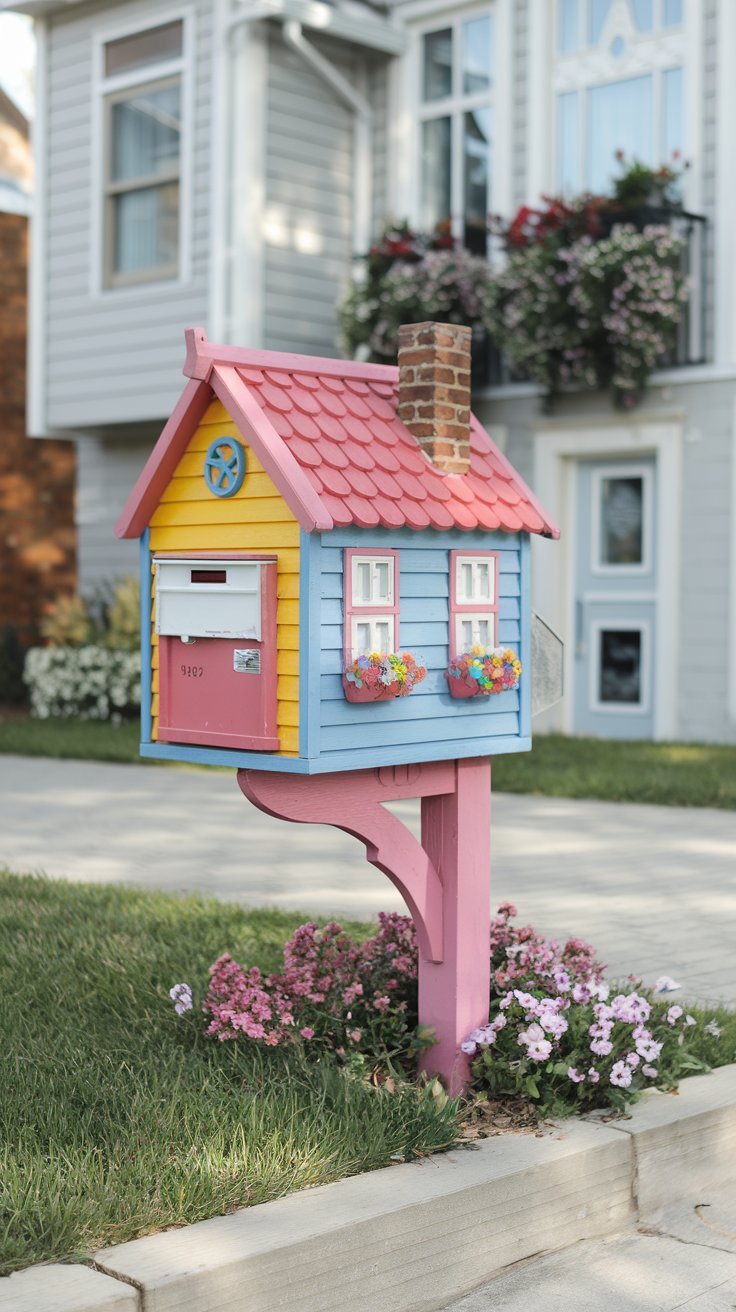 Add fun and personality with a mailbox shaped like a miniature house, painted in bright colors. Include quirky details like shutters or a tiny door and use UV-resistant paint to keep the colors vibrant over time. Position it at eye level for maximum charm.