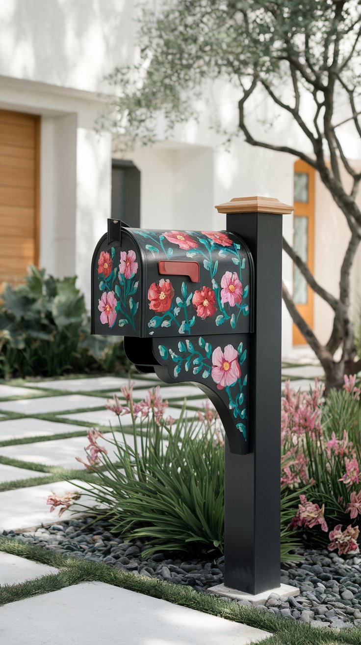 A vibrant, hand-painted mailbox with a floral motif on a sleek black post brings artistic charm to your yard. Use weather-resistant paint and sealant to preserve the design, and keep the post s finish clean for contrast.