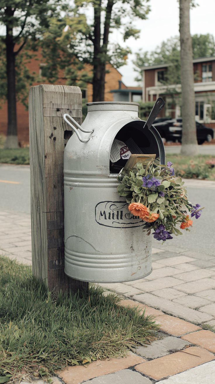Transform an old milk can into a unique mailbox. Paint it in rustic hues or leave it natural for a farmhouse vibe, and secure it with a sturdy base to prevent tipping.