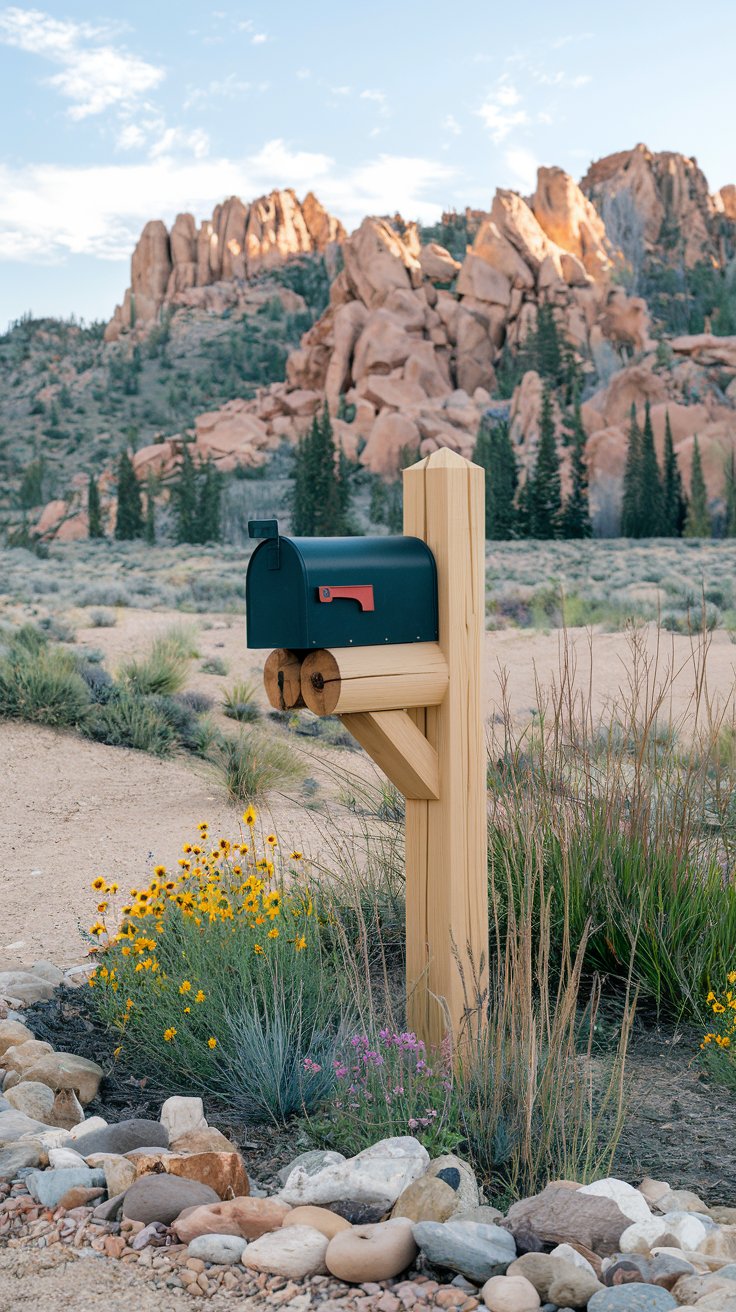 Nestle a mailbox among natural rocks and wildflowers for a seamless blend into the landscape. Use native plants for easy care and create a tiered rock arrangement for added depth.