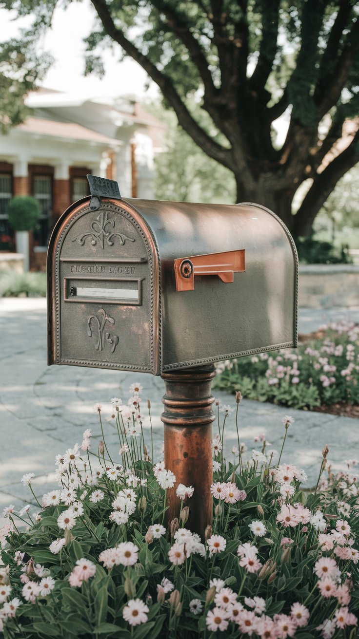 An aged copper mailbox exudes vintage charm. Use a clear coat to maintain the patina and pair it with a dark post to highlight the copper s warm tones.
