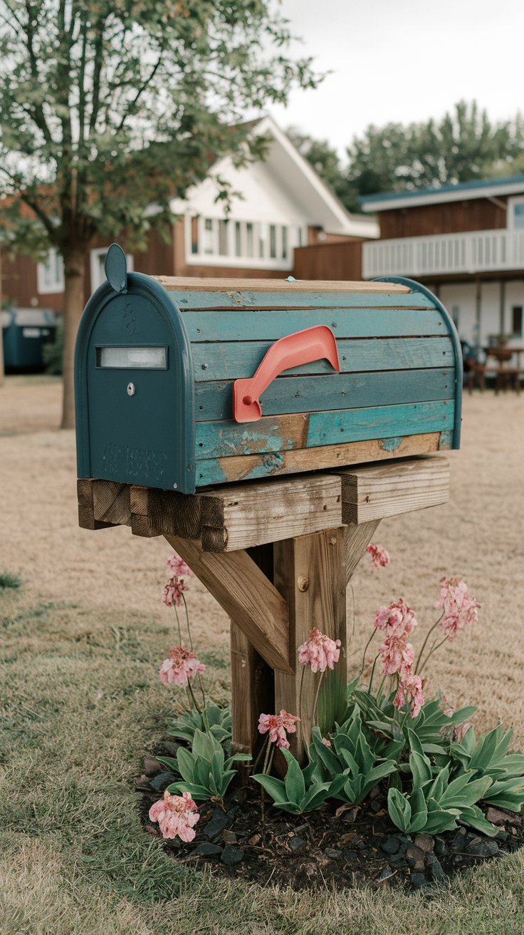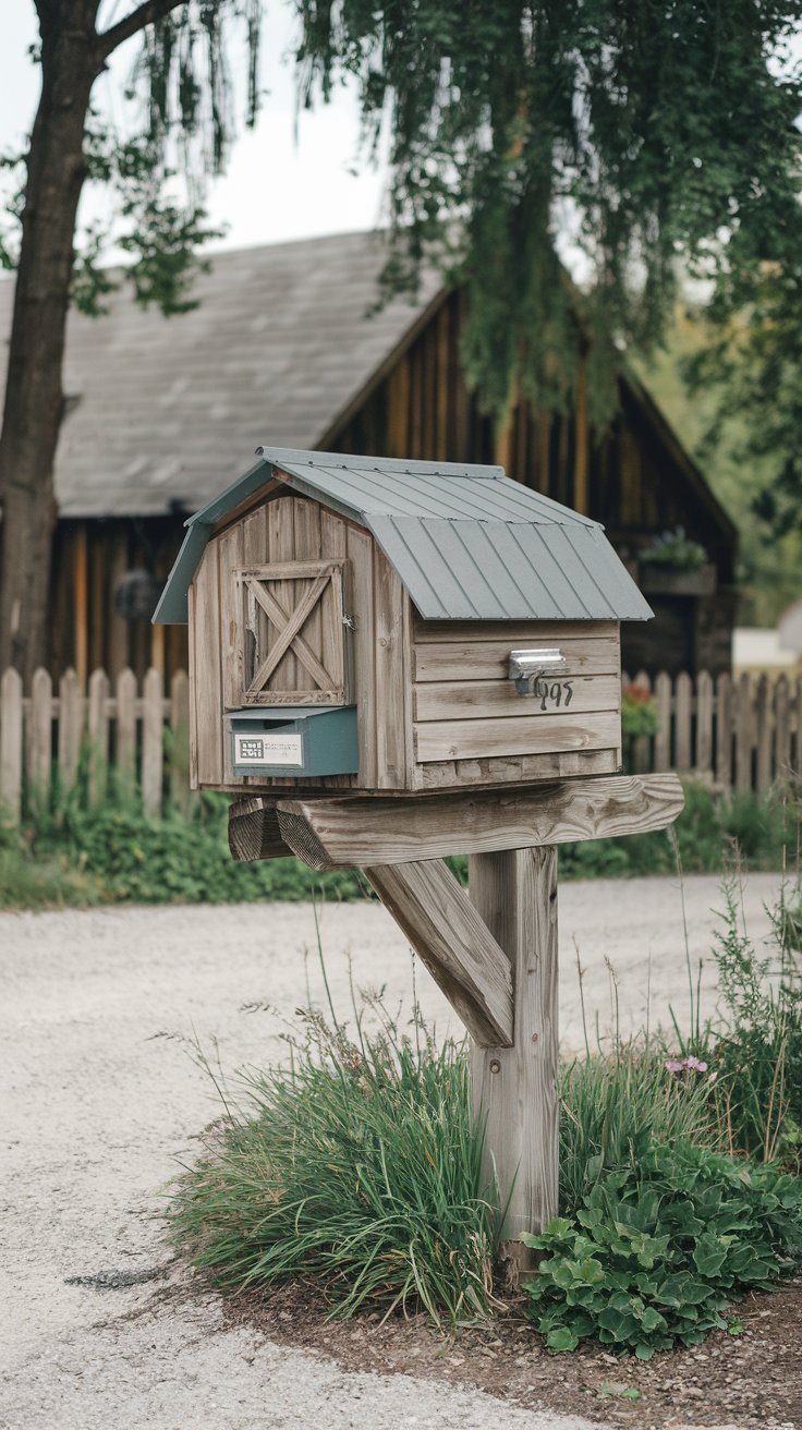 A distressed wooden mailbox with a barn-style roof on a sturdy timber post delivers rustic charm. Use weatherproof stain to enhance its durability and add decorative hinges for an authentic touch.