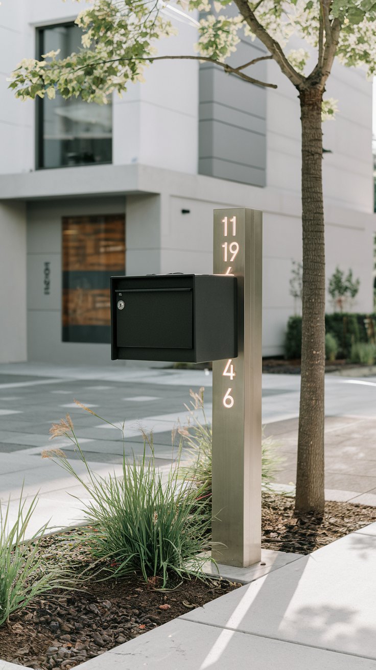 A matte black mailbox with LED address numbers on a sleek aluminum post offers a futuristic touch. Ensure the LEDs are weather-resistant and solar-powered for efficiency.