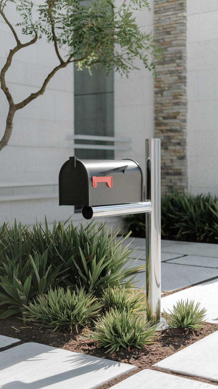 A minimalist black and silver mailbox mounted on a polished metal post exudes sophistication. The clean design pairs well with modern homes, offering a sleek contrast to natural surroundings. Opt for a stainless steel finish for durability and add a reflective strip to enhance visibility at night.