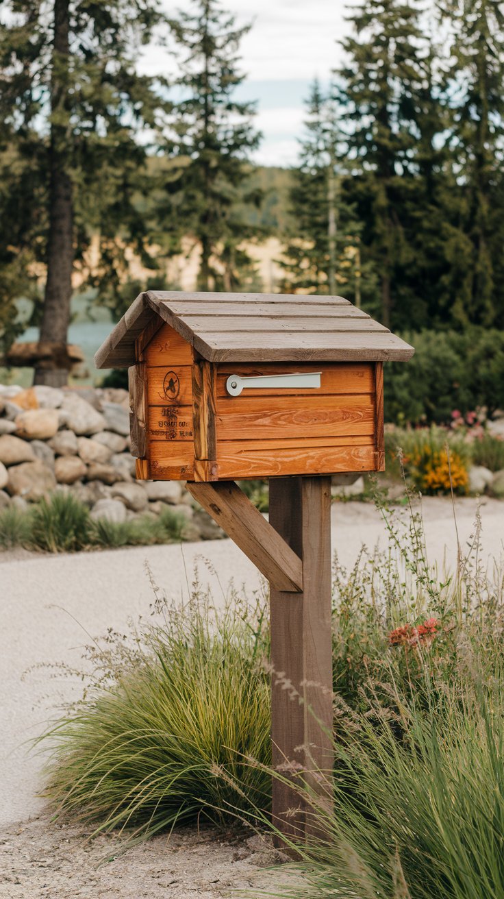 This handcrafted wooden mailbox with a rustic finish on a sturdy cedar post creates a welcoming country vibe. Seal the wood to prevent weathering, and consider adding a carved house number for an extra personal touch.