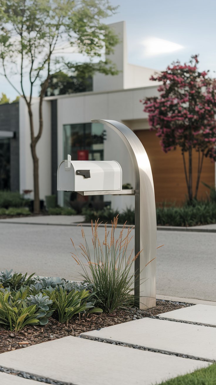 A curved steel mailbox post supporting a modern white mailbox with clean lines is ideal for contemporary homes. Keep it simple with a glossy finish and add a small solar light beneath for nighttime elegance.