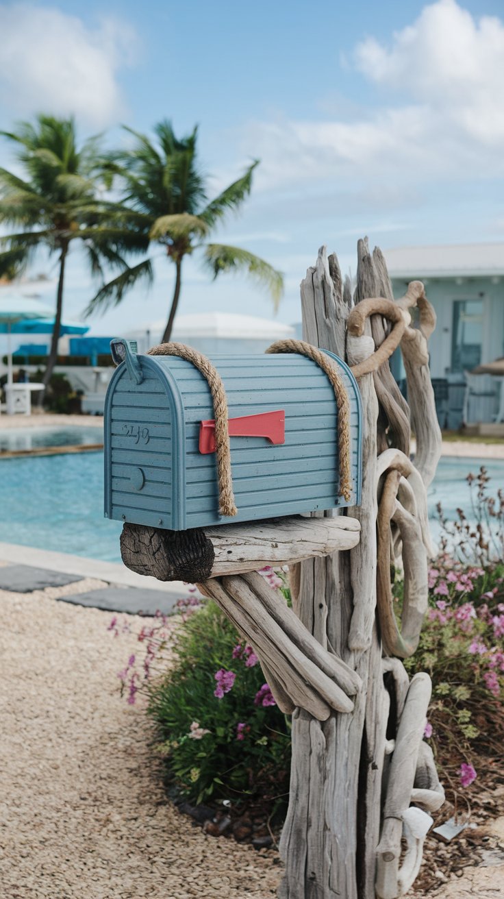 Channel a seaside vibe with a blue mailbox adorned with rope accents, mounted on a driftwood post. Add seashells or a small anchor motif for added flair, and ensure the post is securely treated against moisture.