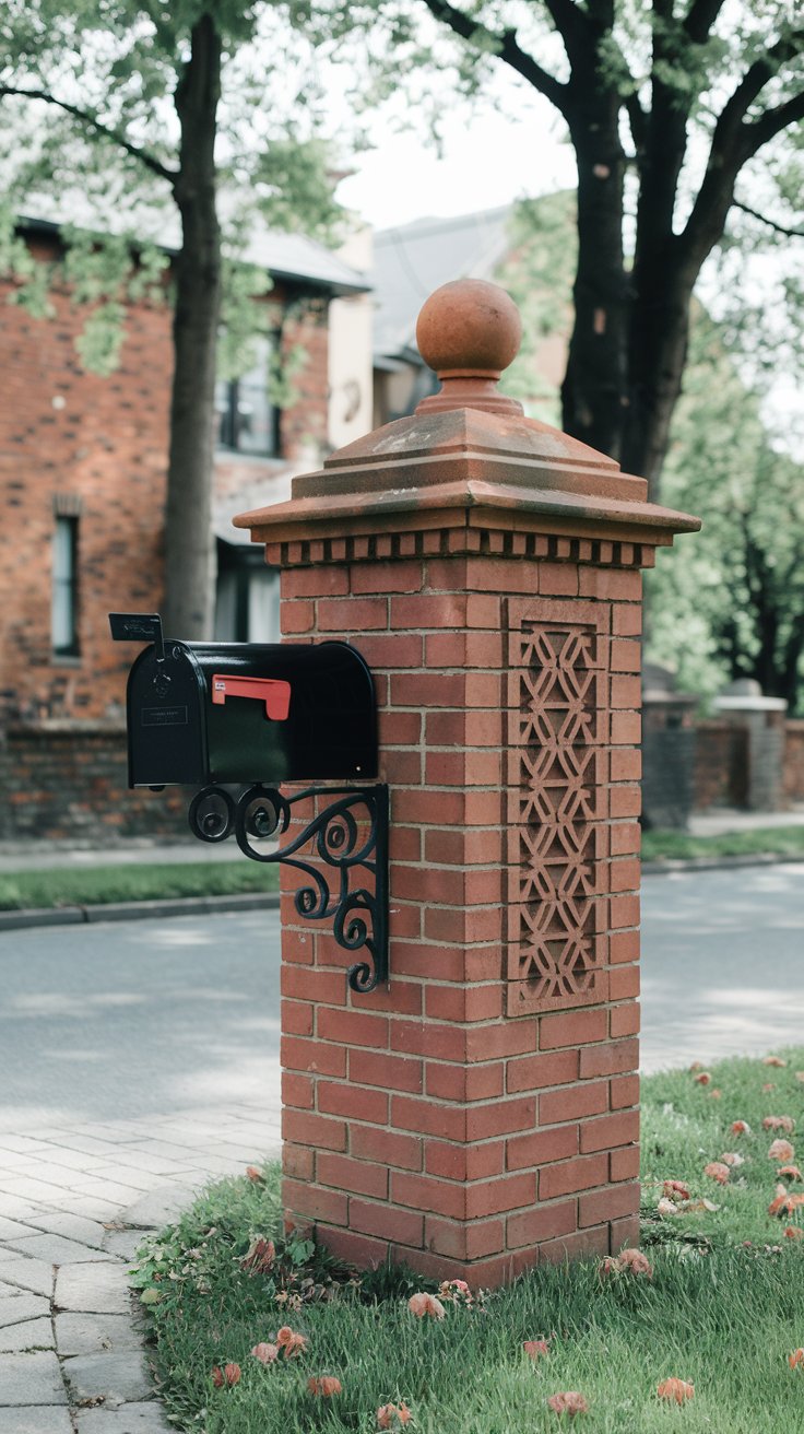 A red brick mailbox post with decorative patterns offers a stately appearance. Match the brick style to your home and add a stone cap for a polished finish.