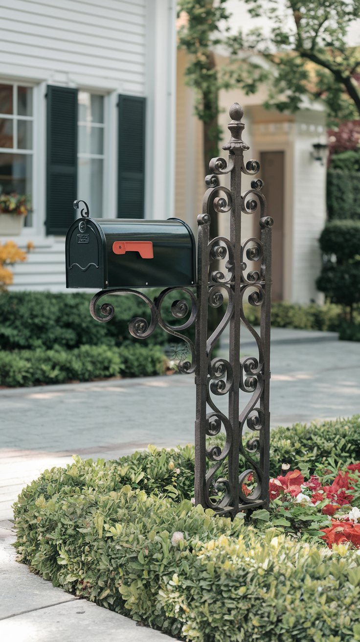 A wrought iron mailbox post with intricate details, paired with a classic black mailbox, creates a timeless aesthetic. Treat the iron to prevent rusting and add a lantern on top for vintage flair.