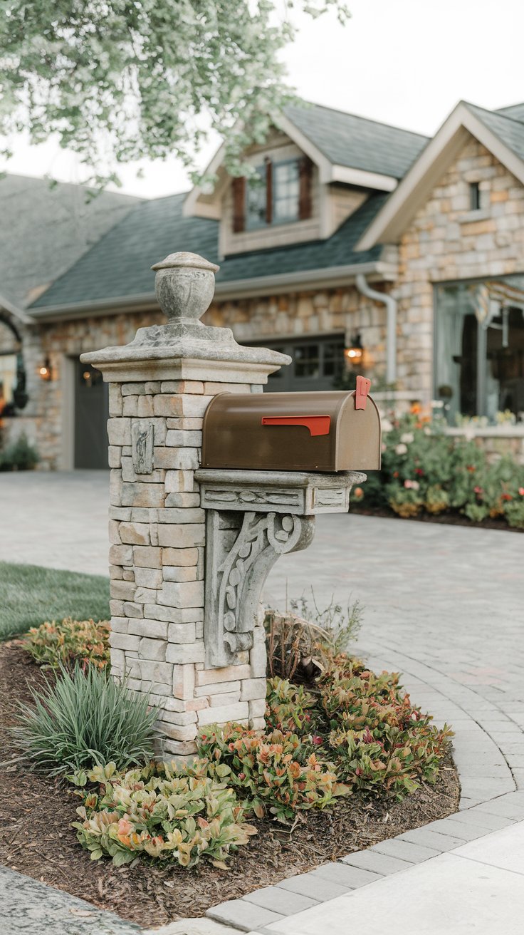 A natural stone mailbox post with a weathered finish holding a bronze mailbox radiates timeless elegance. Use locally sourced stone for authenticity and ensure the mailbox is properly anchored for stability.