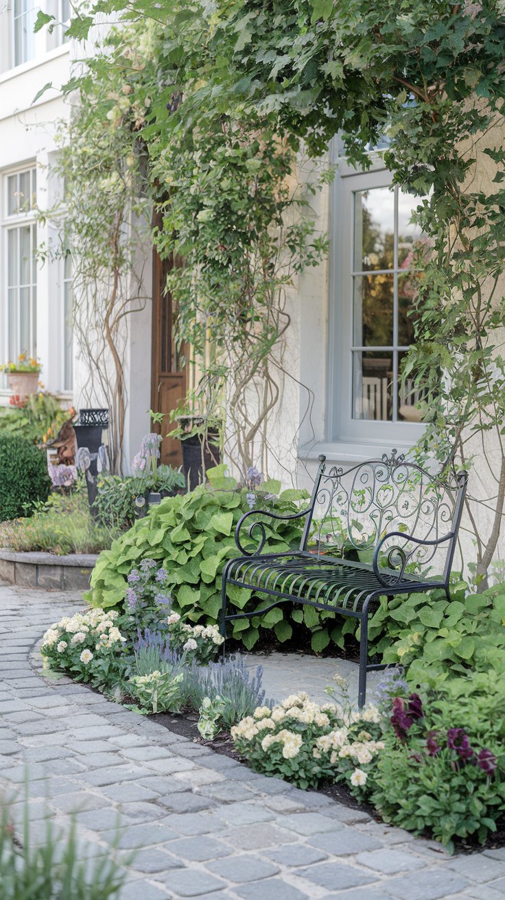 A cobblestone path leading to your door can be paired with small flower beds and a charming metal bench for a welcoming garden design.