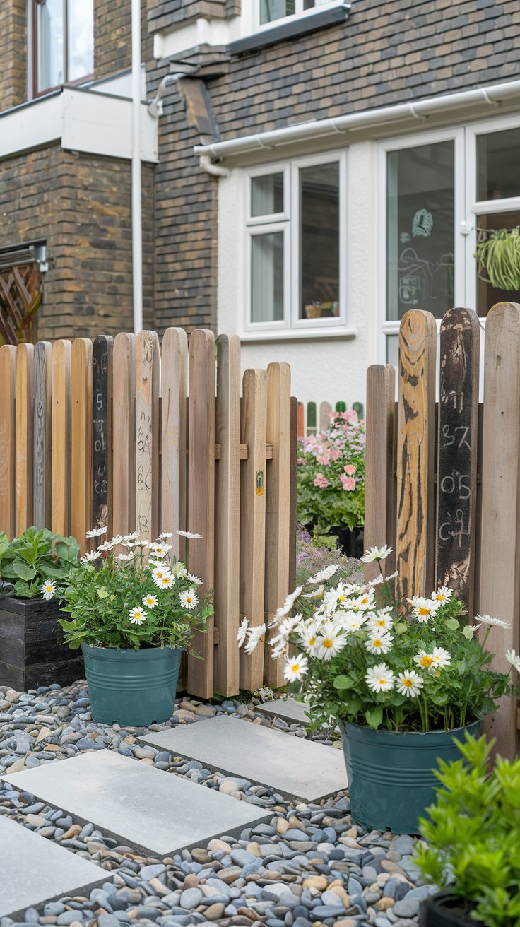 Create an affordable yet stylish garden with a recycled wooden fence, potted daisies, and a pebble pathway. This design is both eco-friendly and charming.