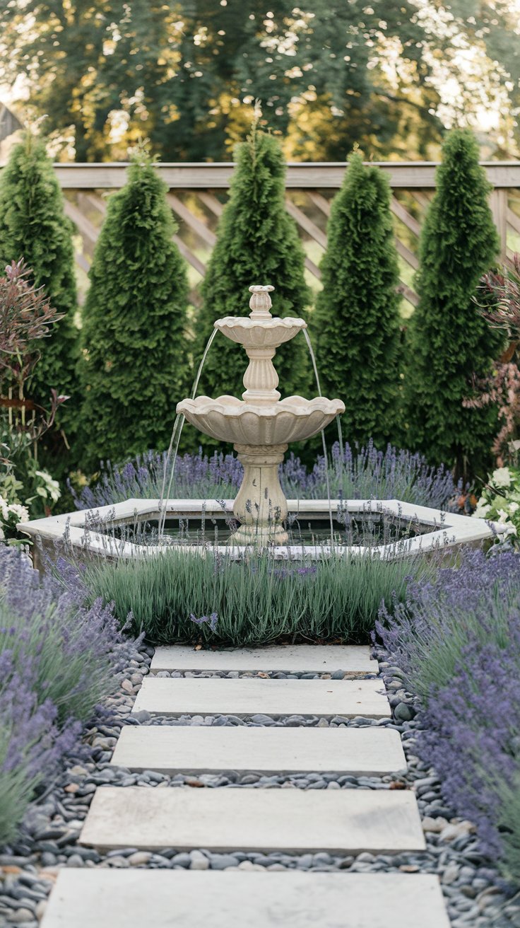 Make a statement with a small water fountain centerpiece surrounded by lavender and evergreen shrubs. This elegant garden design exudes tranquility and sophistication.