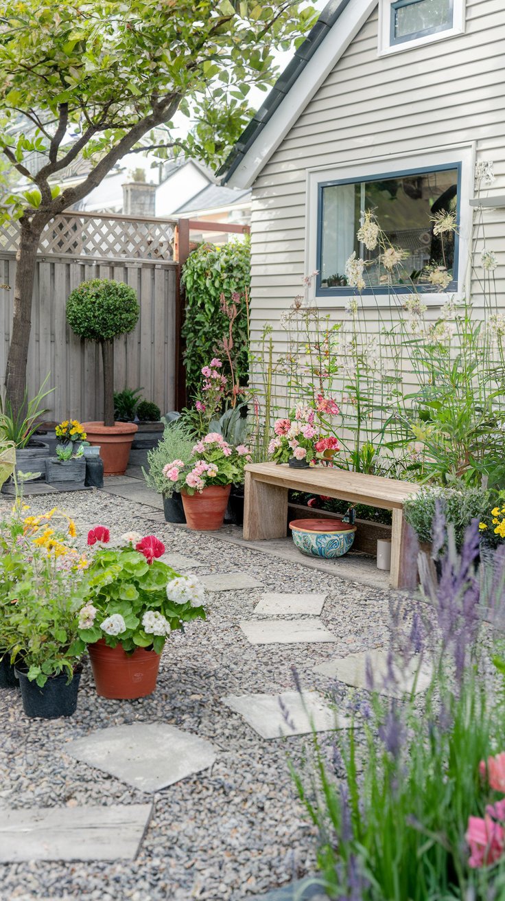 Combine a gravel pathway with clusters of vibrant potted plants. Enhance the space with a DIY wooden bench surrounded by seasonal flowers for a welcoming and cozy vibe.