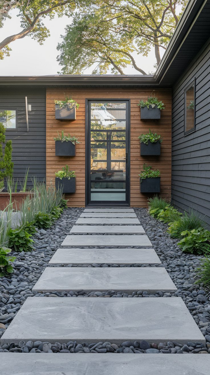 Achieve a sleek, modern style with concrete stepping stones set on a pebbled ground cover. Vertical planters add height and visual interest to this contemporary design.