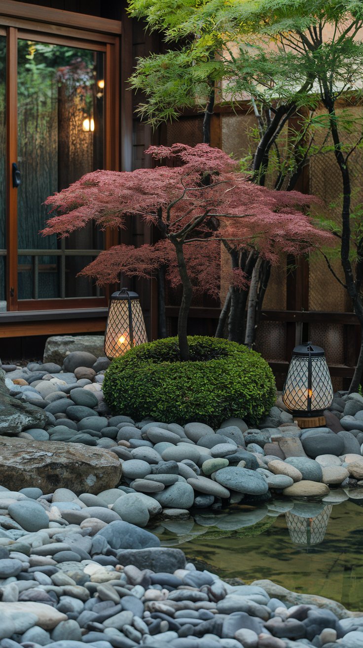 Create a serene space with smooth river stones, a Japanese maple tree, and decorative lanterns. This simple garden design offers a peaceful escape.