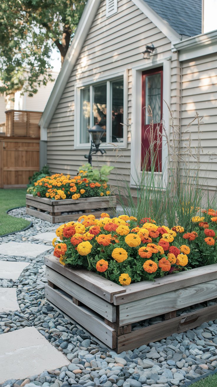 For a budget-friendly design, use upcycled planters to hold vibrant marigolds. A pebble path ties the look together, offering an affordable yet cheerful front yard.