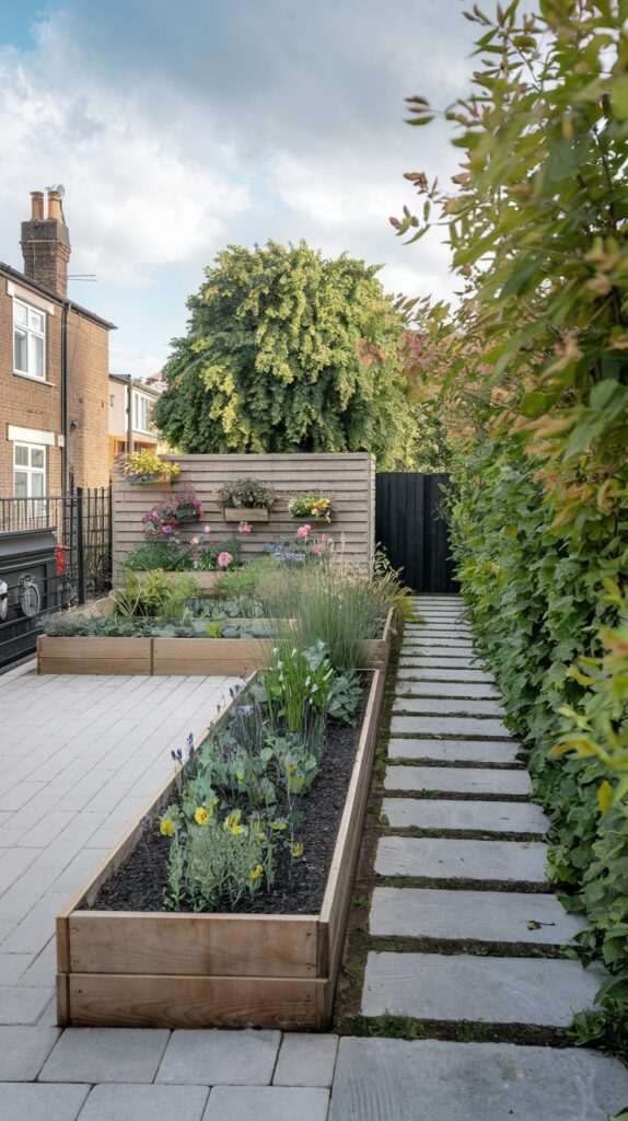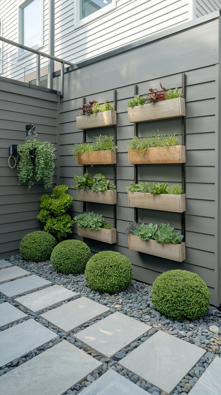 Maximize greenery in compact spaces with vertical planters on walls. A pebble pathway and dwarf shrubs make this design both functional and visually appealing.
