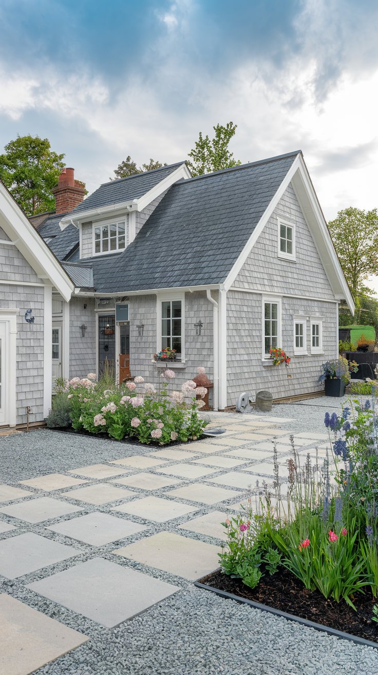 Combine practicality and beauty by designing a front yard with gravel and pavers for parking. Add colorful flower beds with seasonal blooms for visual balance.