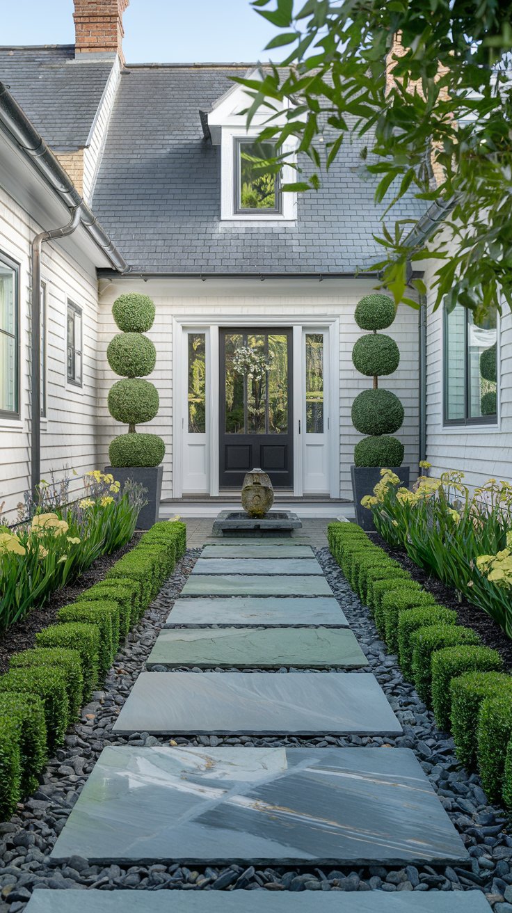Add elegance with decorative slate stones, a small water feature, and evergreen topiaries. This refined look offers year-round beauty.