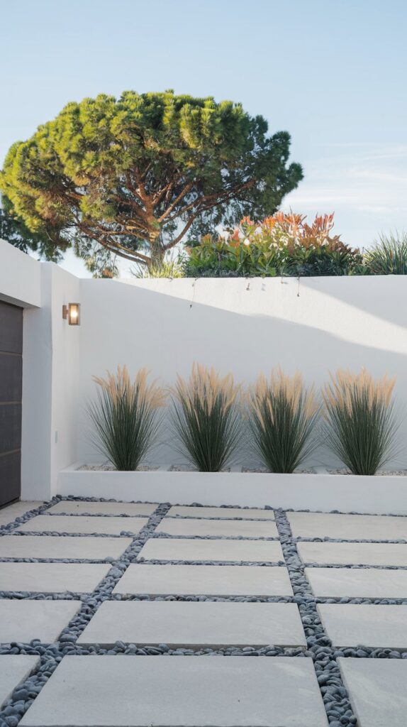 Surround your driveway with minimalist planters, pebbles, and a row of sleek ornamental grasses. This stylish design is ideal for small spaces.