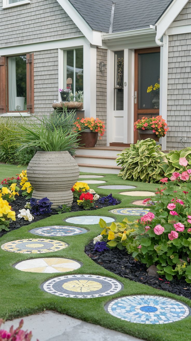 Unleash your creativity with mosaic stepping stones, a sculptural planter centerpiece, and bright flowers for a unique, artistic front yard.