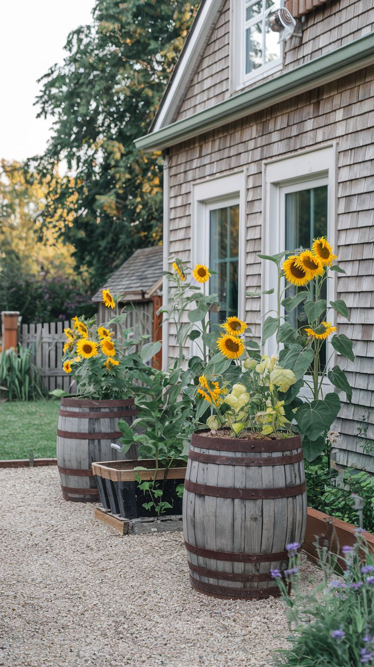 For a countryside vibe, use wooden barrels as planters filled with sunflowers. A gravel path adds rustic charm, making your garden feel like a cozy retreat.