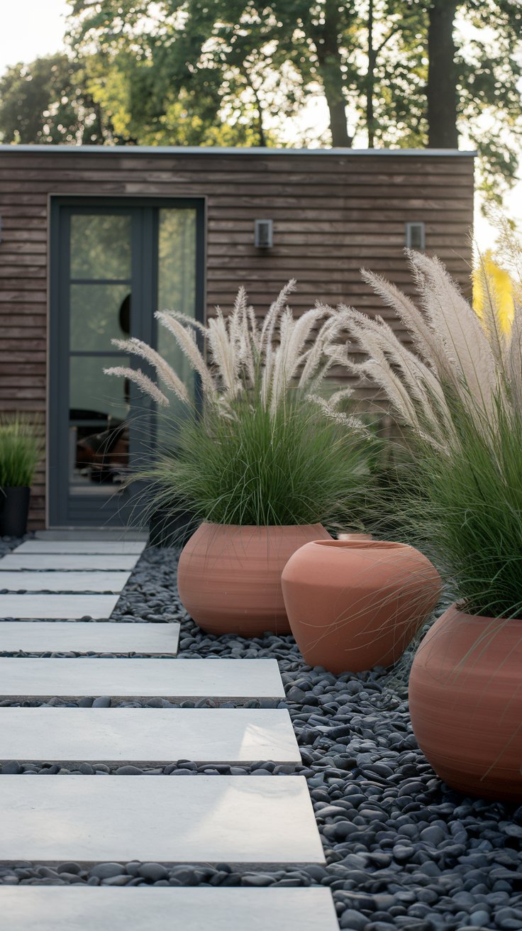 Use large terracotta planters paired with sleek black pebbles and tall ornamental grasses to create a chic and modern garden.