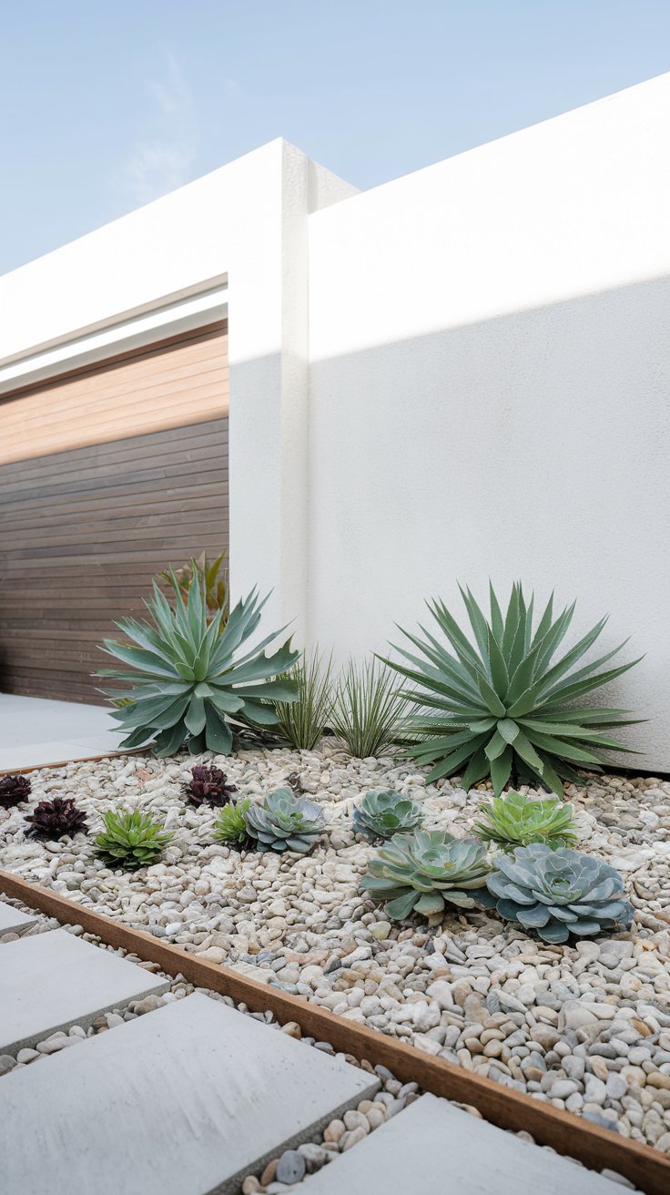 Opt for a minimalist front yard design with pebbles and low-maintenance succulents. A small wooden border can define the space and add warmth to the stark simplicity.