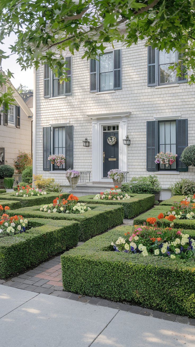 Create a polished look with symmetrical boxwood hedges framing colorful flower beds. Add a small pathway leading to the front door for a timeless, classic garden design.
