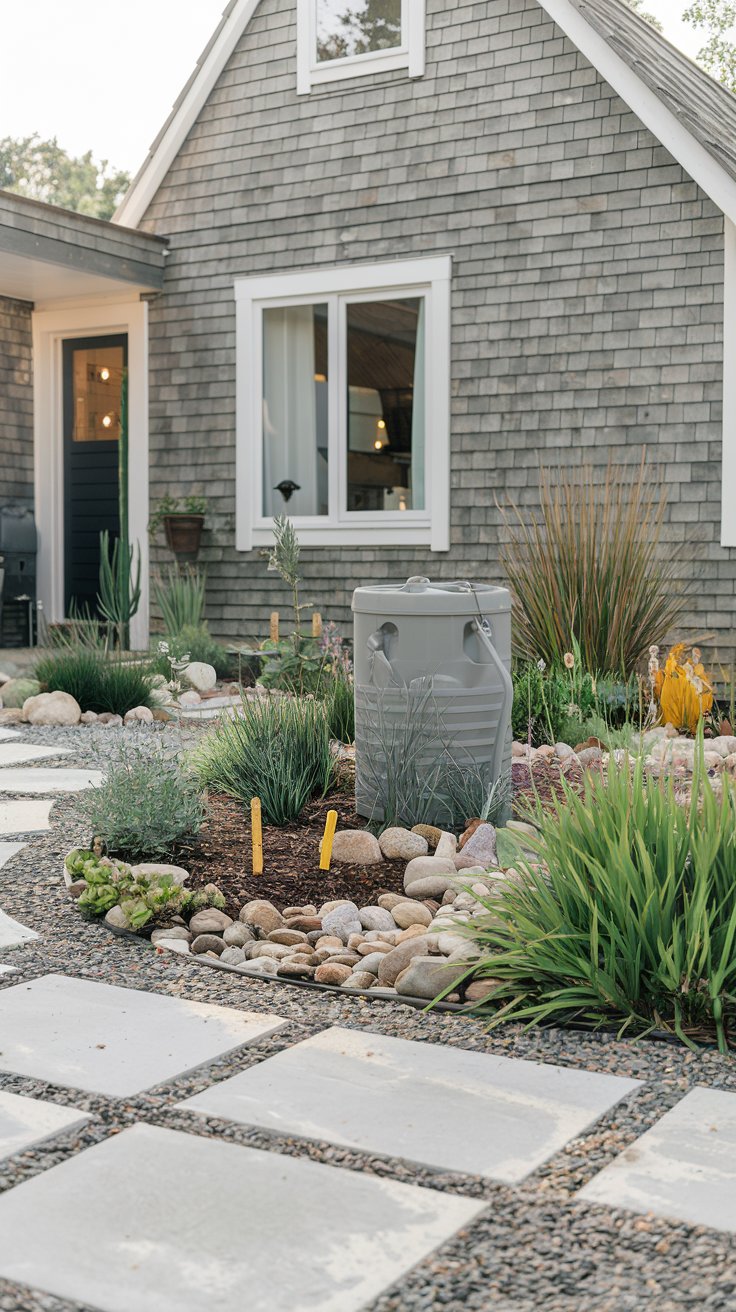 Go eco-friendly by planting native species, adding a rainwater collection barrel, and covering the ground with gravel to reduce water usage.