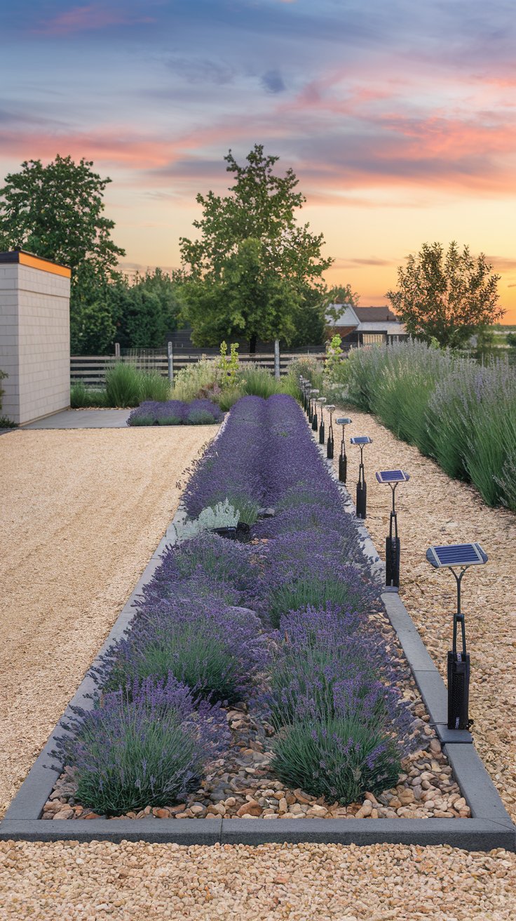 Combine functionality and charm with a gravel driveway bordered by a narrow garden bed of lavender. Solar-powered lights add a warm, eco-friendly touch.