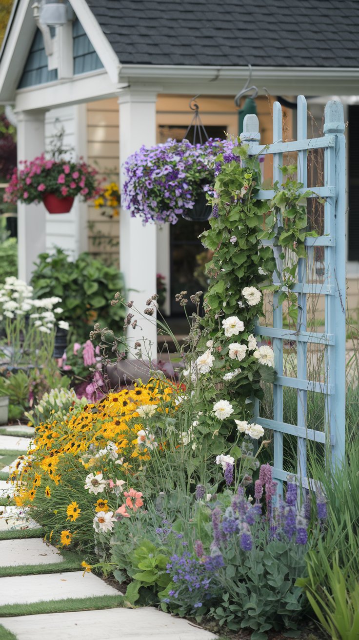 Brighten your front yard with a mix of wildflowers, hanging baskets, and a painted wooden trellis for climbing plants. This colorful setup adds charm and energy.