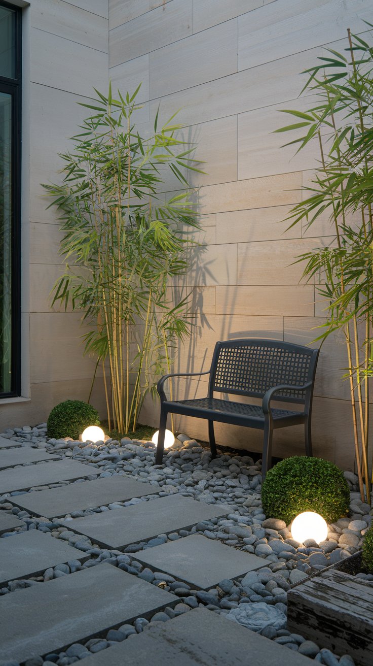 Transform your front yard into a tranquil haven with bamboo plants, pebbles, and a small bench. Soft lighting enhances the peaceful ambiance.